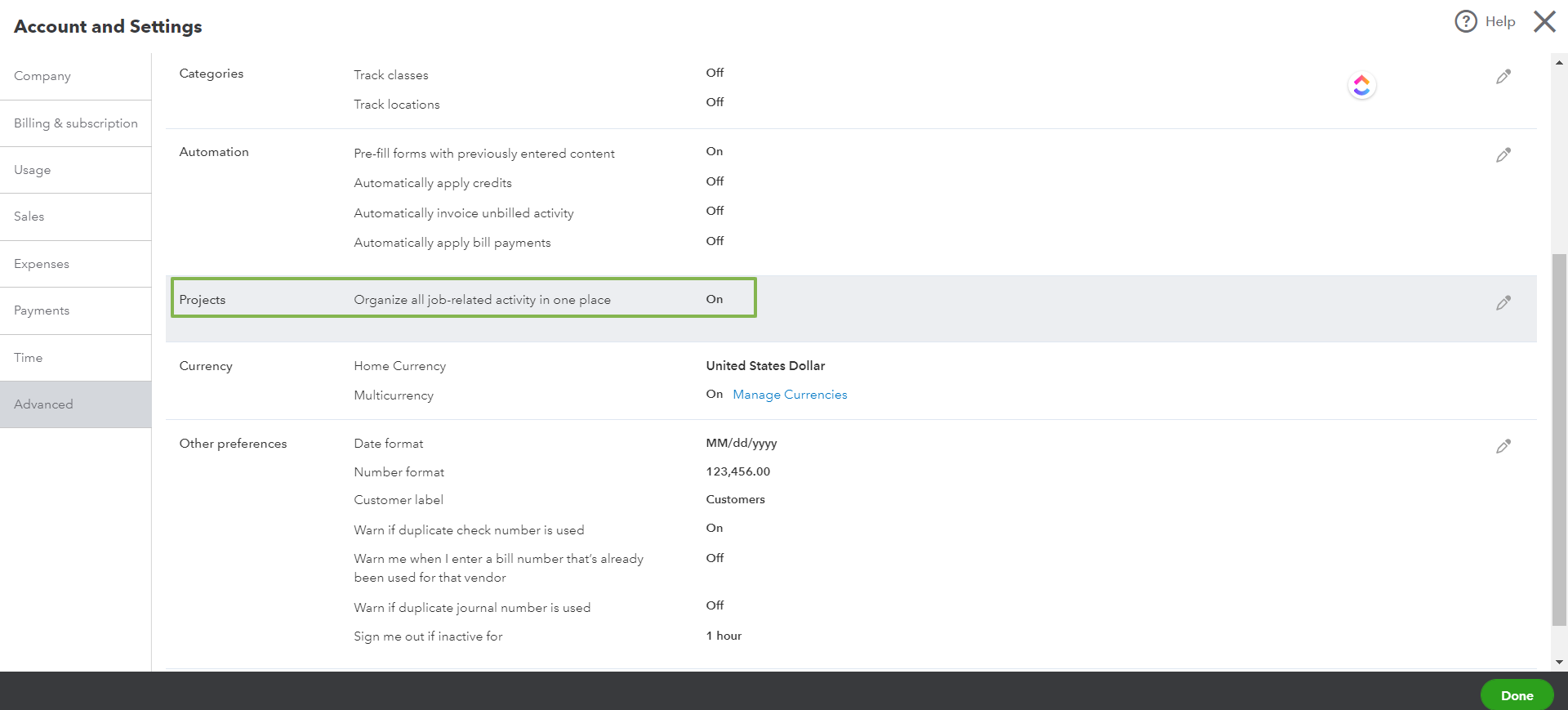 Note: This step is completely optional and it can be skipped if you do not use Projects in Quickbooks.