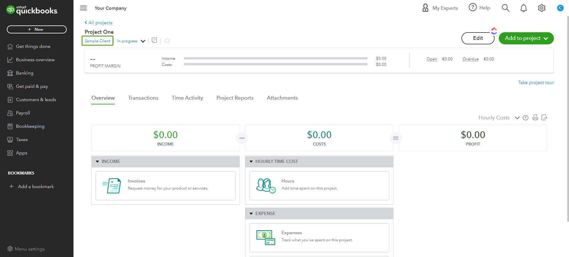 2. Next to the Project Name at the top of the screen, you will see that there is the option to select a QBO project.