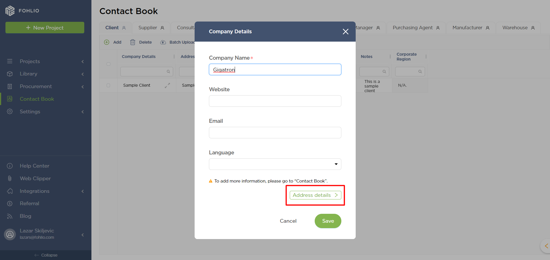 - When creating a new contact you can go to “Address details” to add the address of the contact.