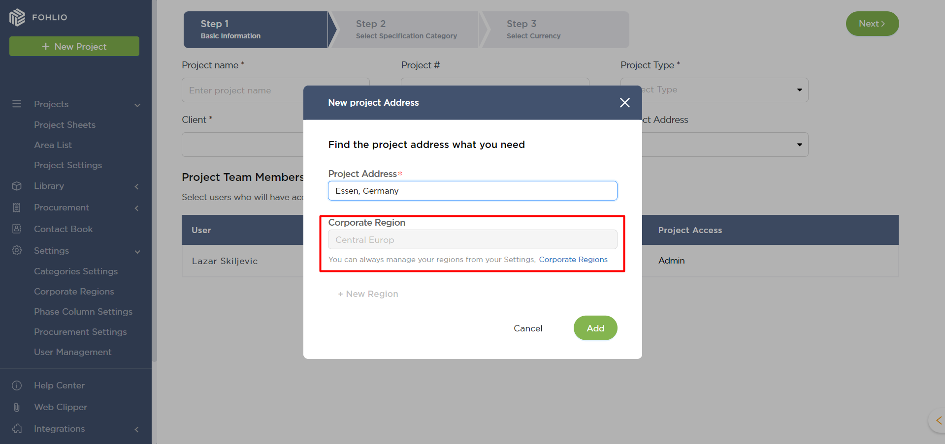 - By pressing on “+ New Address”, a pop-up will show where you can add the project’s address. The corporate region in this window will auto-fill from the already created corporate region in your settings.