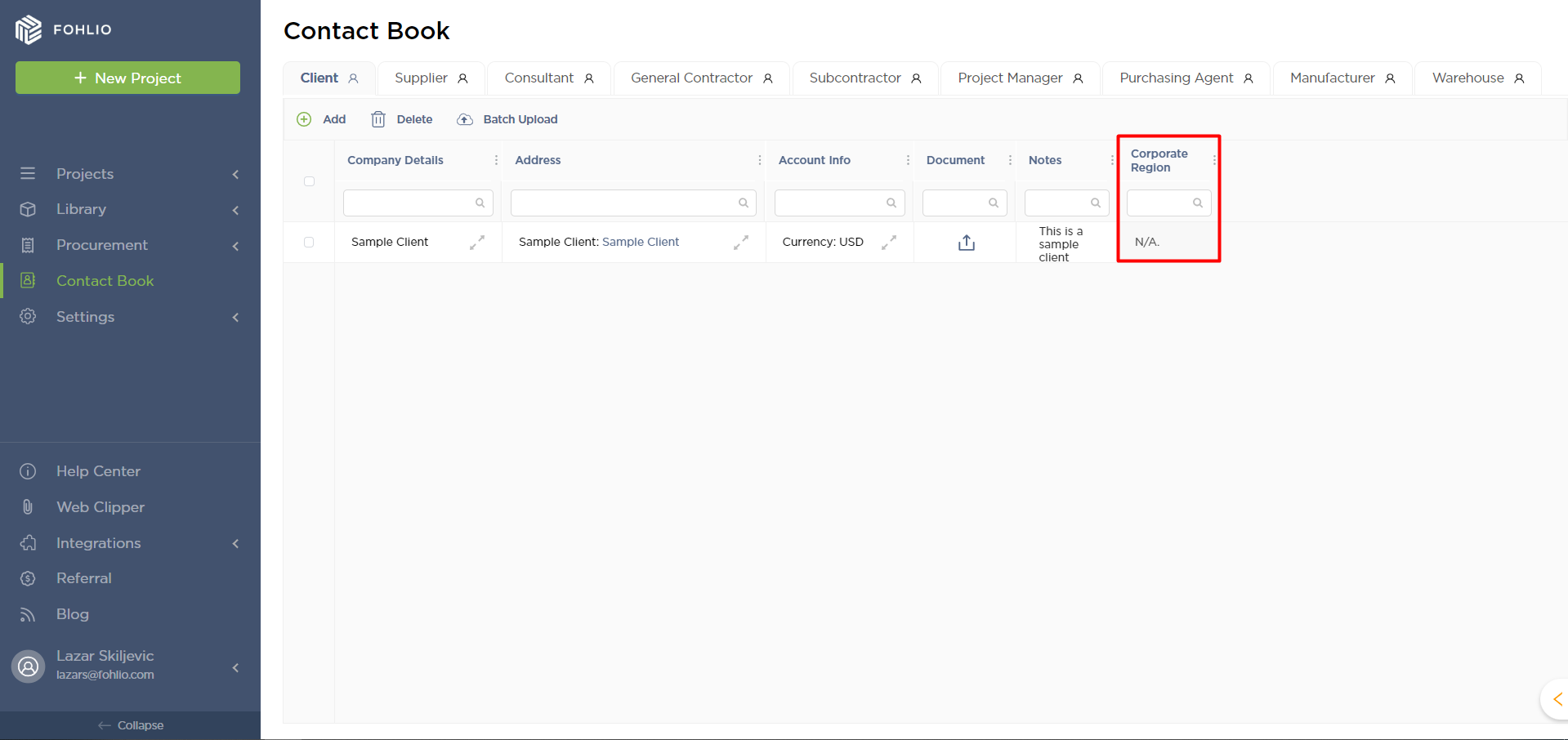 - Another area that is connected to regions is Contact Book. Here you can see that contacts will have corporate regions corresponding to them.