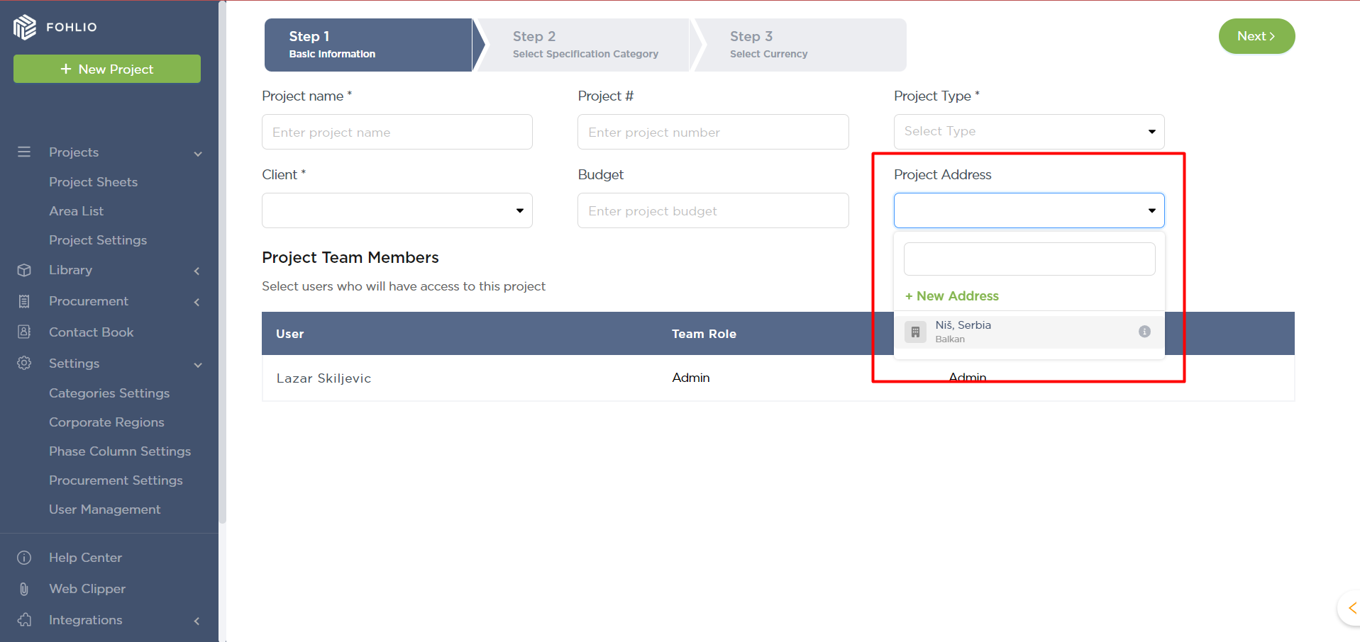 - Regions are connected to projects, when you are creating a new project there is a new field called “Project Address”. Here you can add where the project is situated: