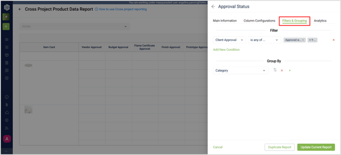 In the Filters and Grouping section, you can tailor your report for specific conditions.