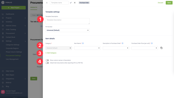 Procurement Templates let you define a reusable set of settings—like PO numbering, document fields, and item detail mapping—and apply them to one or many projects. Edit a template once and every project using it stays in sync.