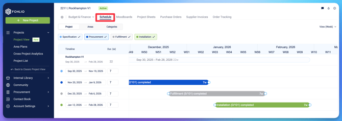 As your team works across Approvals, RFQs, Purchase Orders, and Order Tracking, item statuses update automatically and directly feed into your Project Schedule, progress tracking, and risk indicators.