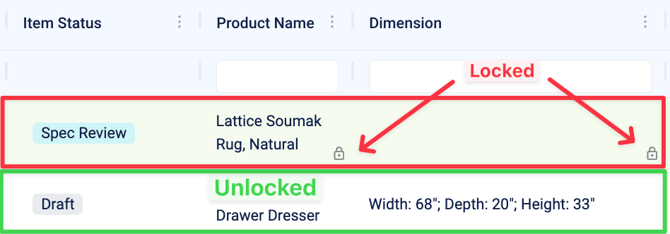 | In Review | Approval workflow initiated | Item enters review process | 🔒 Product-related data columns are locked once this status is selected |