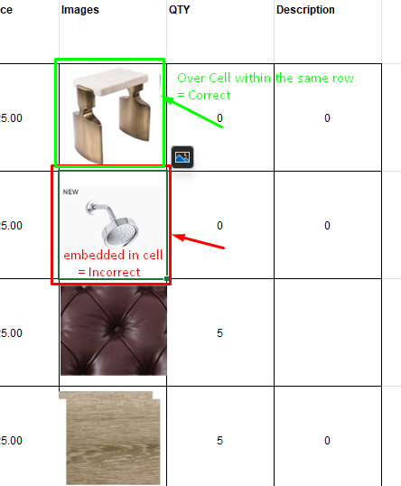 Images should be floating/positioned over cells but aligned with the correct row