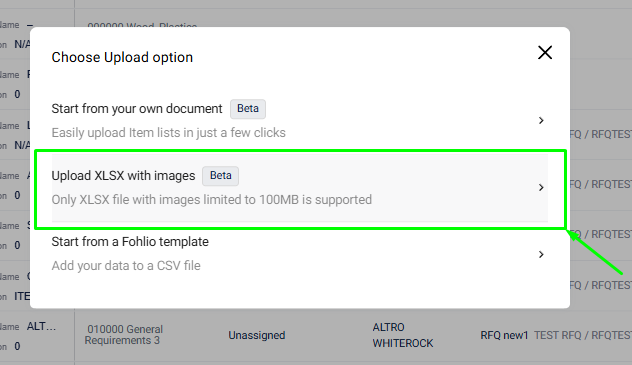 The Upload Items with Images using an Excel file tool allows you to bulk upload items—including images—directly into Fohlio without using templates or ZIP files. This streamlines the process and makes it easier to import data from collaborators, designers, or internal teams.